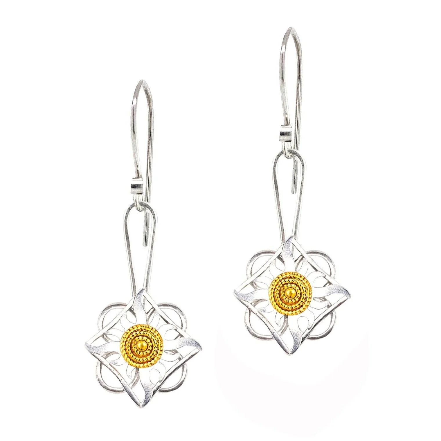 The foundational grouping of this series comprises a quatrefoil of precious metal rings overlain by a central ring and bordered by a diamond-shaped frame. Hand-fabricated of precious metals, the bracelets and necklaces feel like lace in the hand and on the skin. The "Sunspot" and "Solar Flare" groupings feature the frames and cardinal points of the compass rose in precious metals with stylized 18K gold representations of the sun.